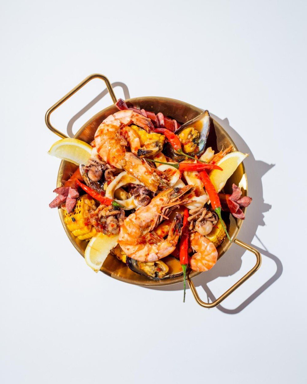 Ассорти из морепродуктов в азиатском стиле !(мидии, кальмары, осьминоги, кукуруза, королевские креветки, тигровые креветки, колбаски, лимон, авторский соус.)